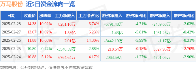 证券之星消息,万马股份2月28日涨停收盘,收盘价14.38元。该股于9点30分涨停,1次打开涨停,截止收盘封单资金为2.35亿元,占其流通市值1.63%。